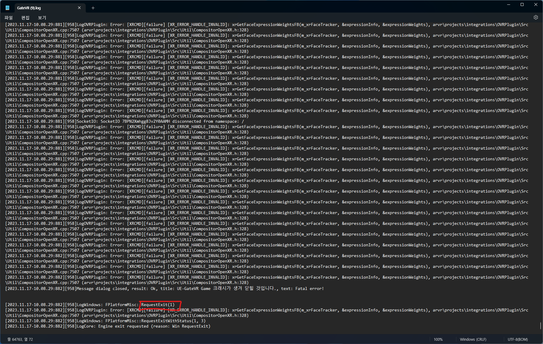 fatal error시, log을 확인해보면 보통 RequestExit(); 함수가 호출되는 것을 확인할 수 있다.