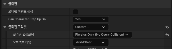2. 콜리전이 No Collision이 아니어야 하며, 콜리전 활성화 모드가 Physics Only 이거나 Collision Enable(Query and Physics)이여야 한다.