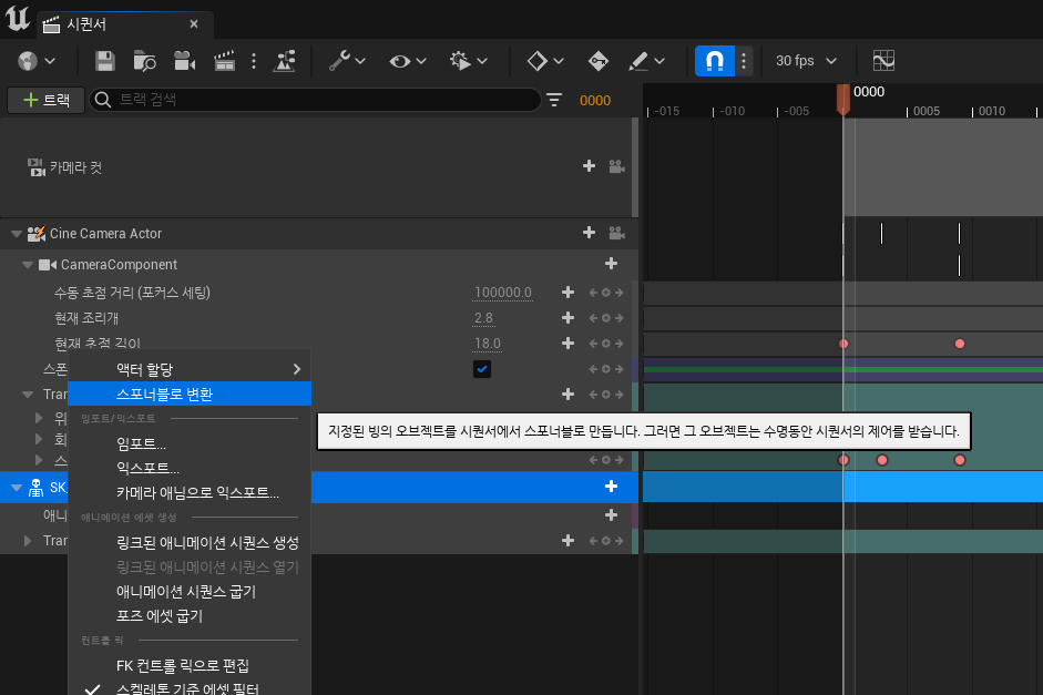 시퀀서에 트랙으로 추가해준 스켈레톤 메쉬의 우클릭에 '스포너블로 변환'을 선택해준다.