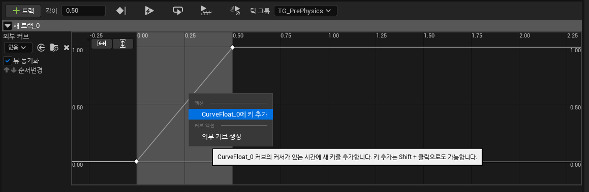 커브에 키를 추가해준다. 키를 클릭하면 시간과 그 시간에 할당될 값을 지정해줄 수 있다.