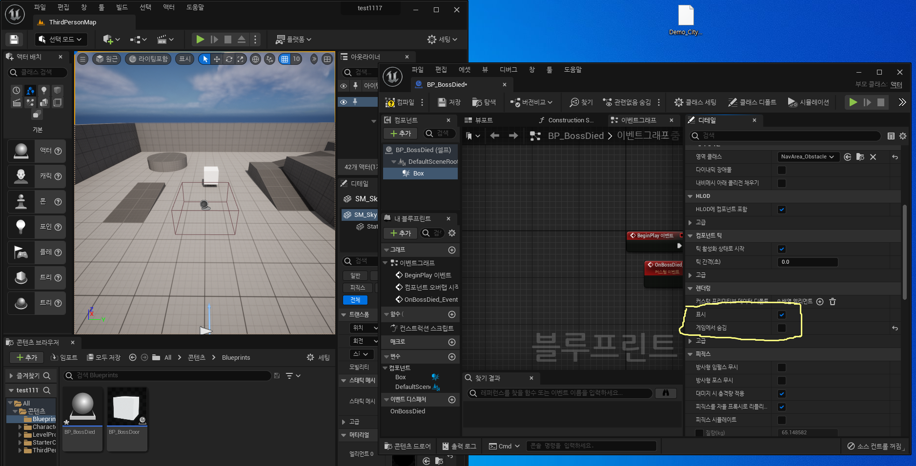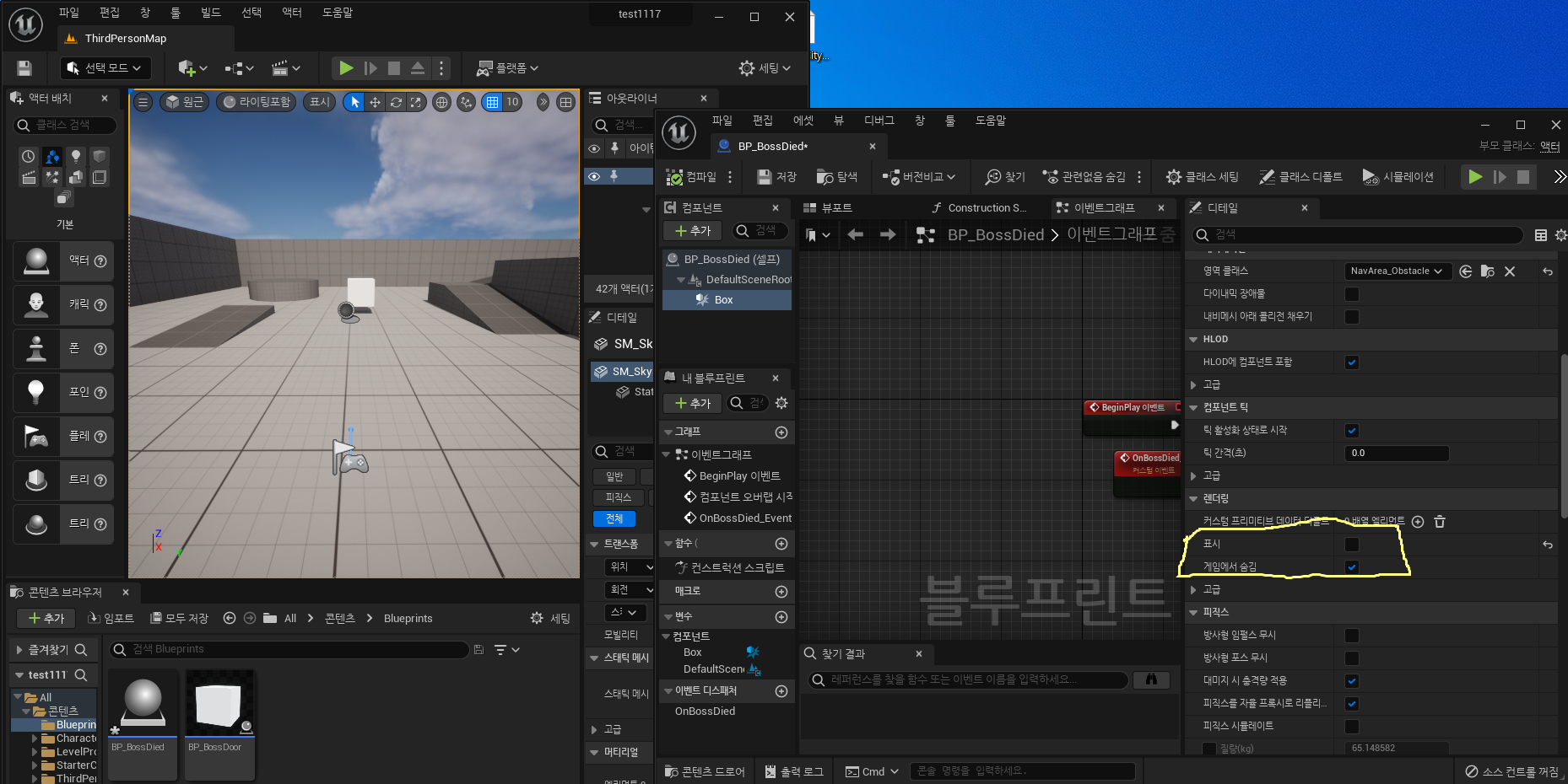 visible과 Hidden In Game 모두 체크 해제 하지만 액터 자체는 레벨에 배치가 되어 있기 때문에