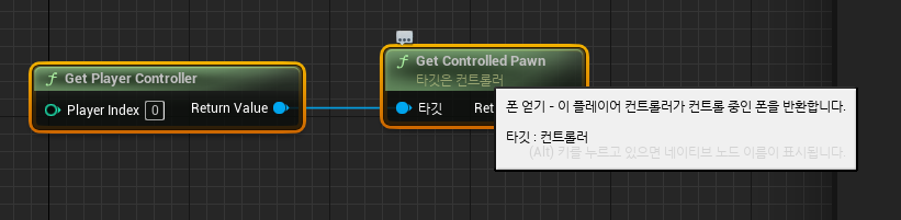 get player controller 노드 생성 후, 연결해 줄 노드인 get controlled pawn과 다른 점은