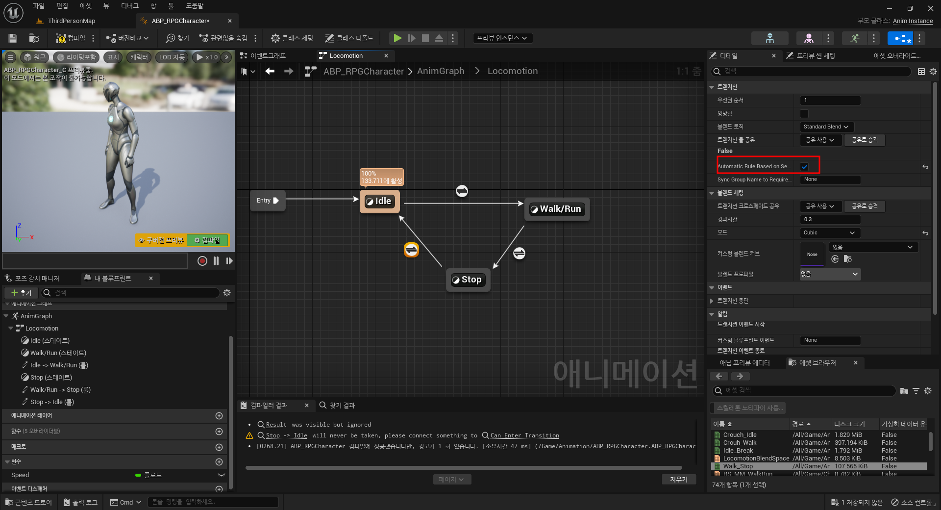 따라서 이 경우, 언리얼 내부에서 제공하는 Automatic Rule Based on Sequence Player in State를 활용하여